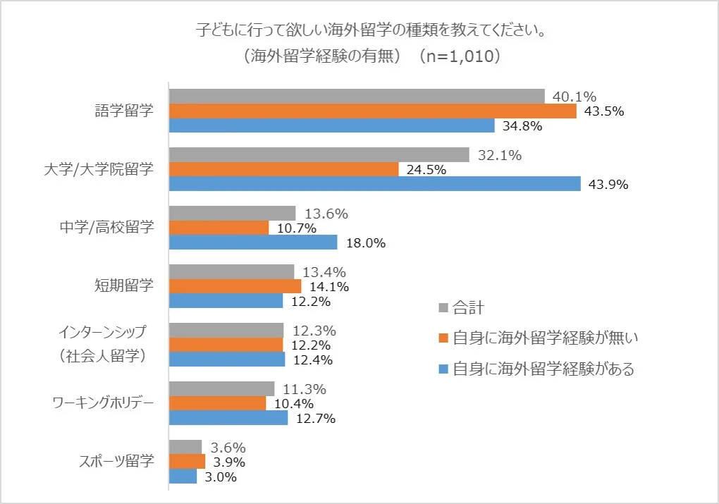 海外留学経験別で見ると、「語学留学」(海外留学経験あり:34.8% 海外留学経験無し:43.5%)、「大学/大学院留学」(海外留学経験あり:43.9% 海外留学経験無し:24.5%)と、自分自身に海外留学経験があるか無いかで、子どもに行かせたい海外留学の種類に違いがあることが分かりました。