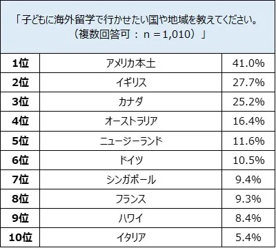 最多回答は「米国」(41.0%)でした、2位に「イギリス」(27.7%)など、自分自身が行きたい海外留学先(調査1)と同様に、上位10カ国中7カ国を『英語圏』の国が占める結果となりました。