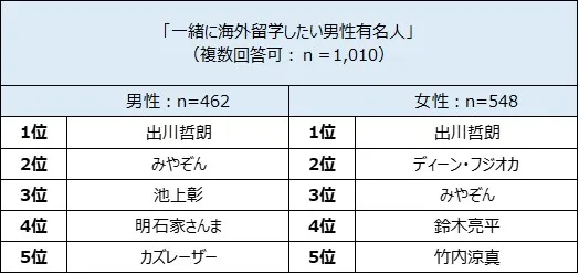 「イモトアヤコ」が男女ともに1位でした。男性有名人1位の「出川哲朗」と同様に、バラエティ番組で危険を顧みず明るく活躍する姿を理由に、多くの人に選ばれる結果となりました。2位も男女ともに「渡辺直美」でした。来春に渡米することが発表されており、世界的インスタグラマーとしの活躍も、多くの人に一緒に海外留学したいと思われる要因となったようです。