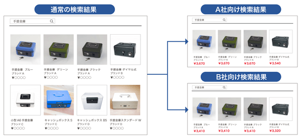 このような背景から、ジーニーはサイト内検索ツール「GENIEE SEARCH」において、「取引先ごとの商品・価格出し分け機能」を開発しました。