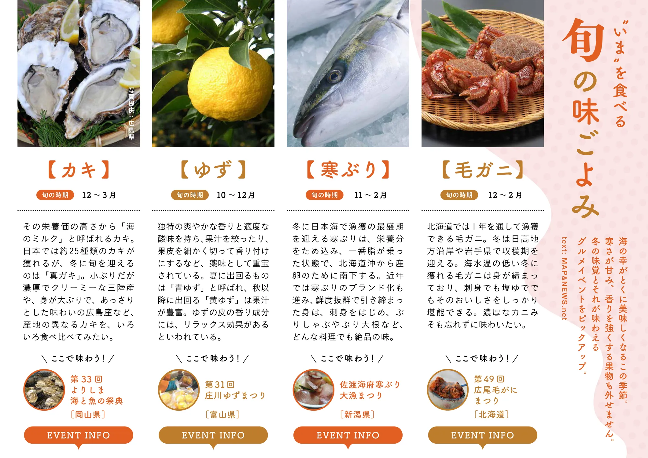 季節の移ろいを感じる――。この時期にもっとも美味しい旬の食材、「毛ガニ」「寒ぶり」「ゆず」「カキ」と、それら食材が味わえるイベントをピックアップしてご紹介します。