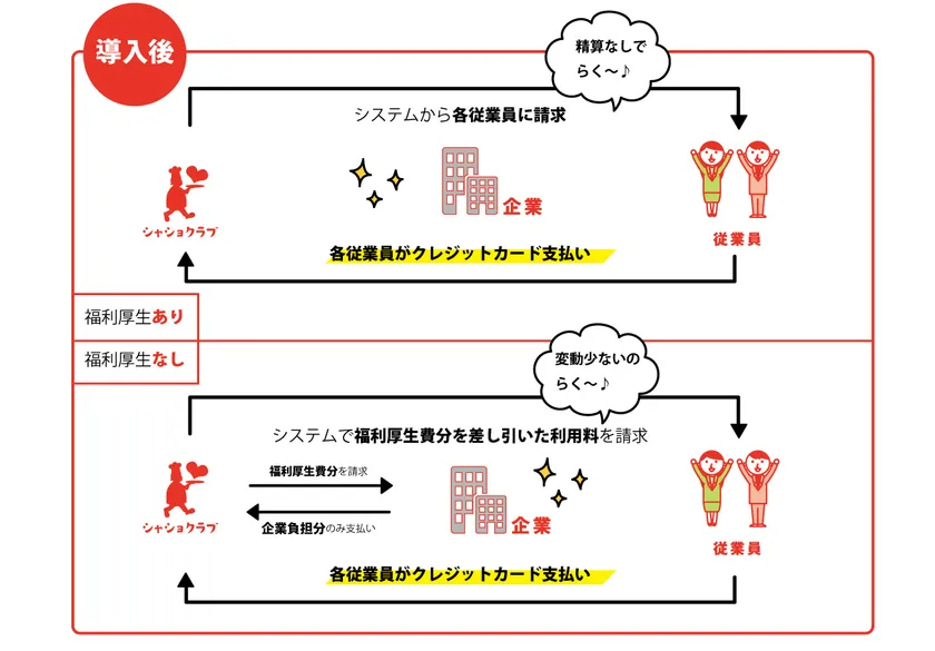 また、給与天引きで管理をされていた企業が、個人クレジット決済に切り替えることで、大幅に経理部門の負担が軽減されます。