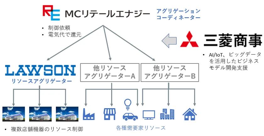 ローソンは、2016年度より慶應義塾大学SFC研究所と共に経済産業省の需要家側エネルギーリソースを活用したバーチャルパワープラント構築実証事業に取り組んで参りました。今般、この実証の経験を活かし、小売電気事業者であるMCリテールエナジーと連携し、ローソンがリソースアグリゲーター※2として店舗機器の適時遠隔リソース制御を行ない、需要家と小売電気事業者における一つのVPPモデルを目指します。