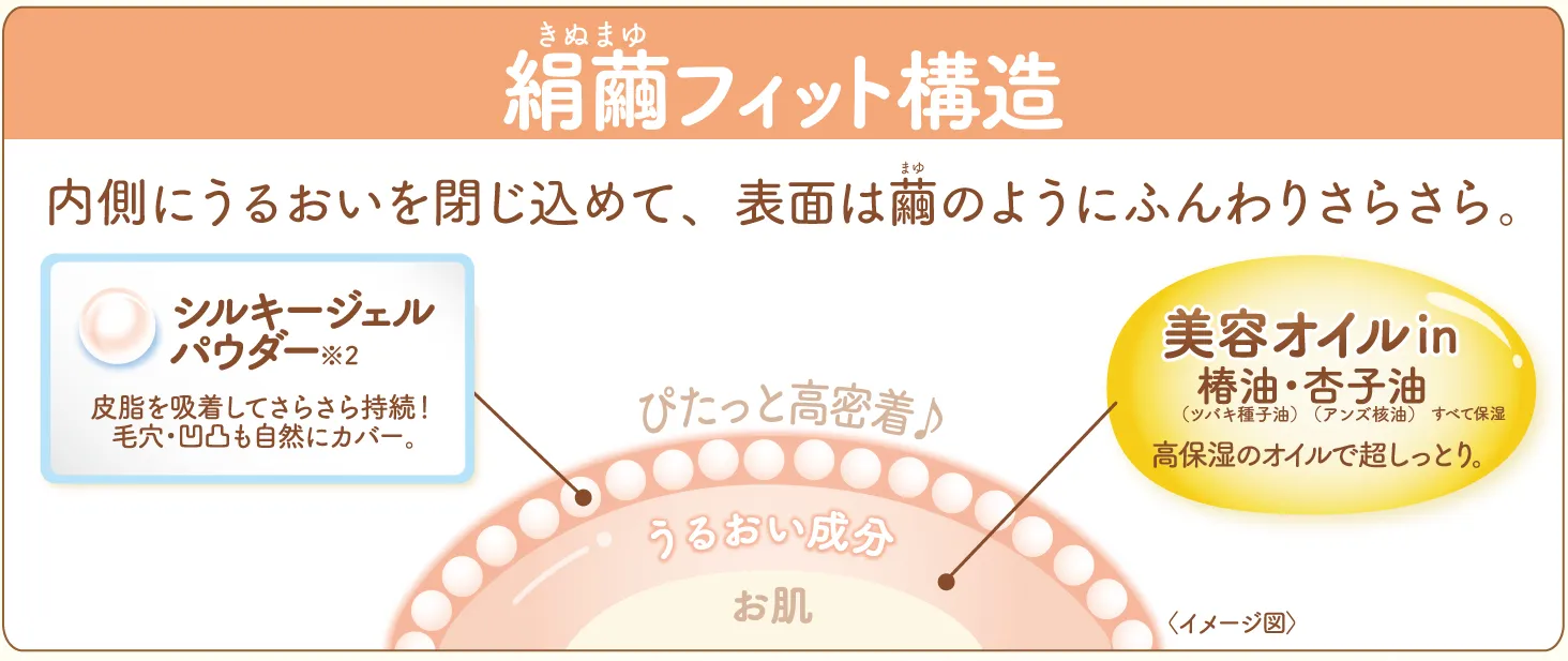 絹繭フィット構造が内側にうるおいを閉じ込め、表面は繭のようにふんわりさらさらに仕上げます。