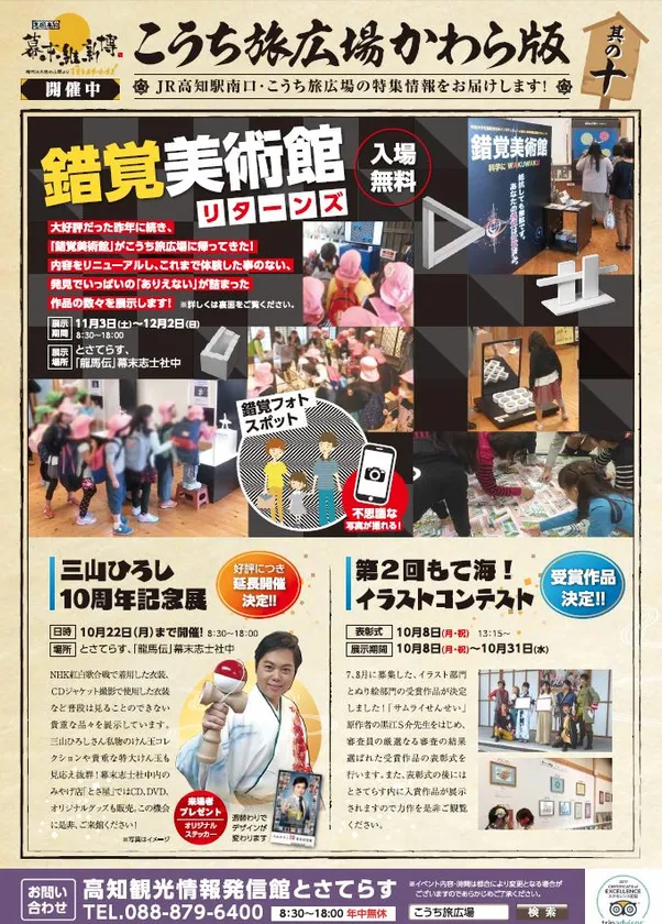 こうち旅広場運営本部は、2018年11月3日(土)~12月2日(日)の期間、錯覚を利用した画像・映像24点を一堂に集めて展示したイベント『錯覚美術館 リターンズ』(場所:とさてらす、「龍馬伝」幕末志士社中)を開催いたします。