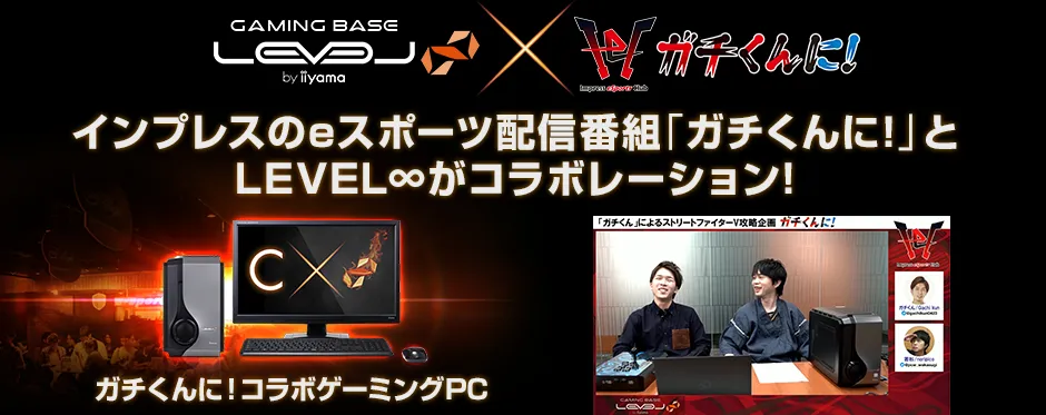 インプレス PC Watchの若杉編集長とプロ格ゲーマーのガチくん氏がMCを務める、eスポーツ配信番組「ガチくんに!」とLEVEL∞とのコラボゲーミングPC全機種が、パソコン工房Webサイトにてお得に購入できるキャンペーンとなります。