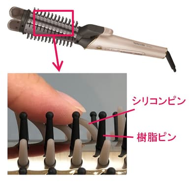 しかし、ブラシアイロンのユーザーの中には、「挟むタイプのアイロンと比べて仕上がりがゆるい、上手く巻けない」、「髪が絡まりやすい」と感じている方も…。こうした不満を解消するため、本製品ではブラシ部分を改良し、新しくシリコン素材のピンを採用しました。キャッチ力のあるピンが短い髪も逃さず捉え、しっかりとクセ付けすることができます。また、髪から外す際にも、シリコンピンが柔らかくしなるため、絡まりにくくなりました。