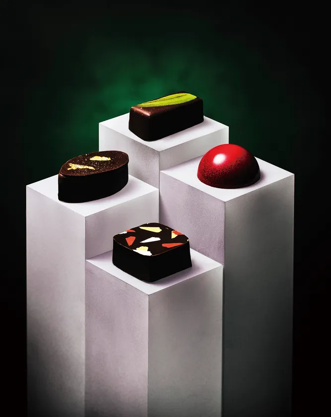 今回の出品作「潮彩(しおさい)」は、日本らしい繊細な味を追求した、“国産果実×国産海塩”のショコラです。果物専門店として“果物とショコラの融合”をコンセプトに、ゆず、干し柿、紅秀峰(さくらんぼ)、ライムをベースに使用したショコラに、それぞれの特徴に合った良質な国産海塩を組み合わせ味わいに彩りを添えました。