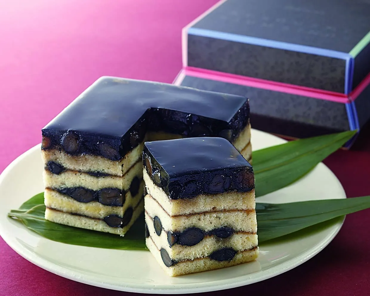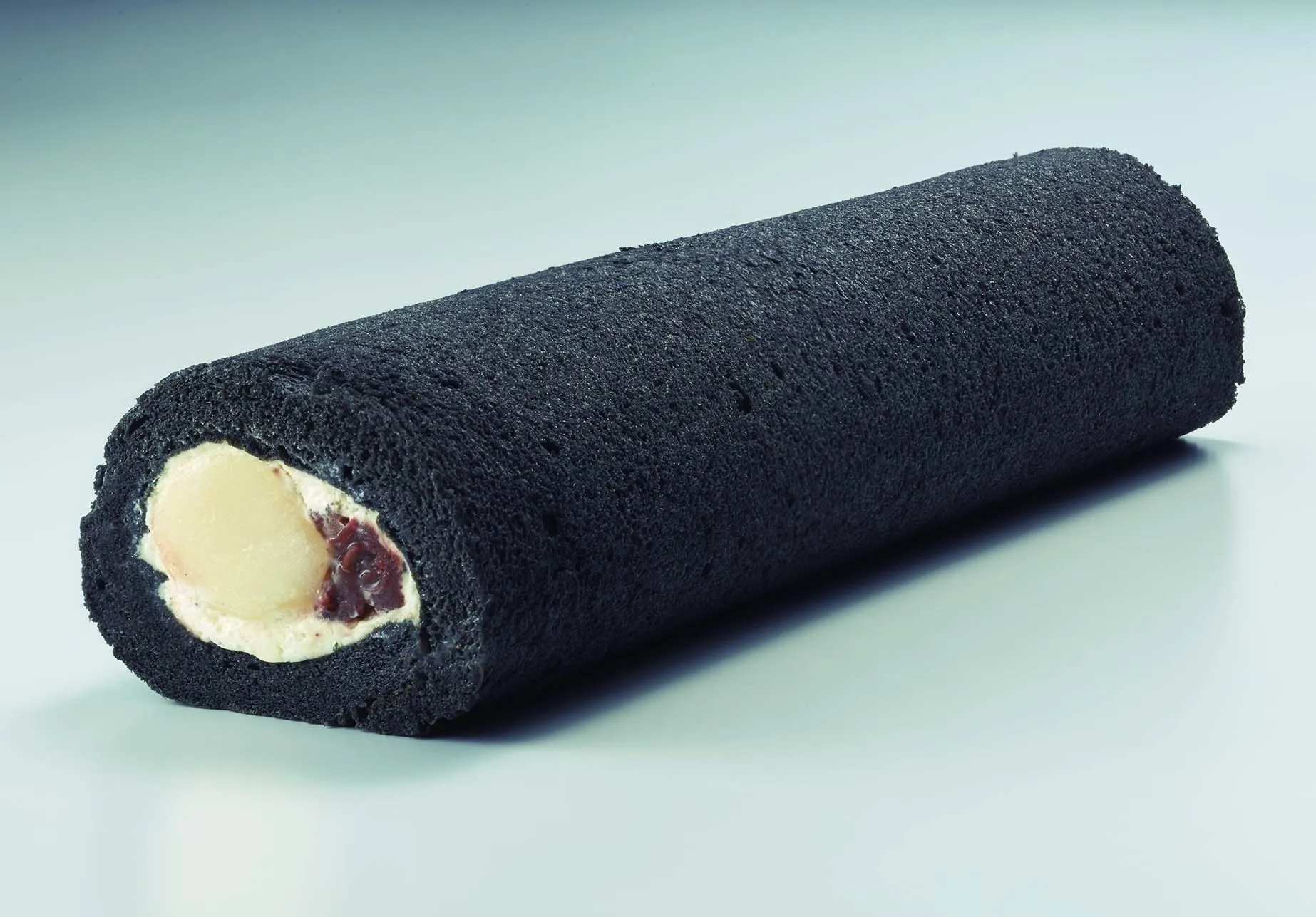 竹炭を練り込んだ黒い生地で、堂島ロールのクリーム、白玉、餡を包みました。