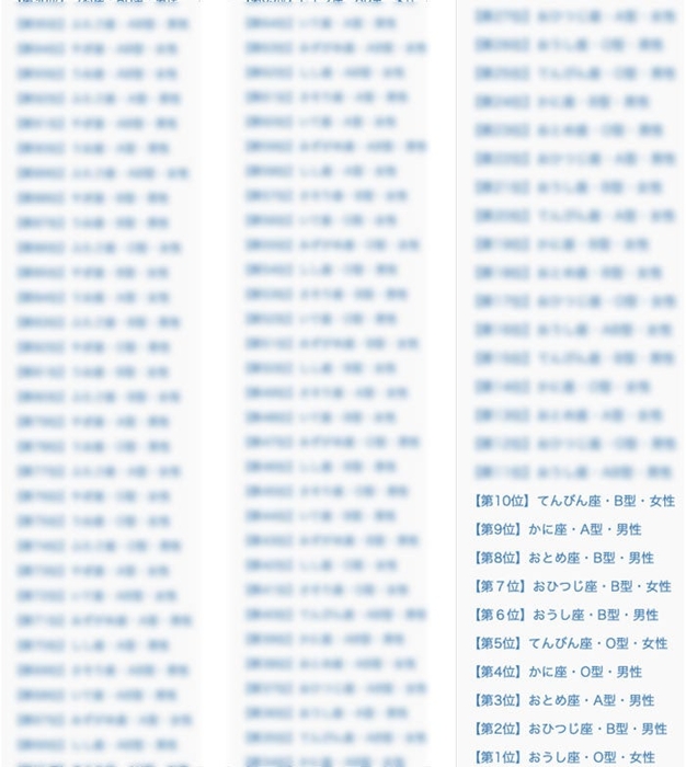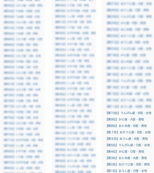 また今回のランキングは、生年月日に基づいて西洋占星術に基づいた生まれ日の太陽の位置を自動計算し星座を導き、加えて血液型の運勢傾向、男性女性の運勢傾向をかけあわせた計96パターンから2023年がどんな年になるのかを割り当てた結果から順位付けをしたものです。