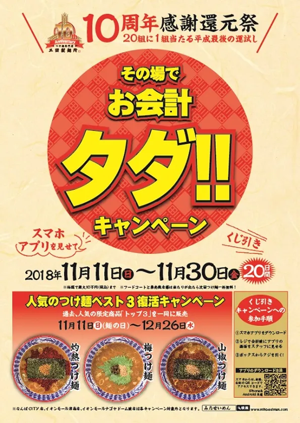 2018年11月11日(日)~11月30日(金)の計20日間、三田製麺所各店にて会計時、三田製麺所アプリご提示のお客様にくじ引きを実施します。くじには20組に一組の割合で当たりが入っており、当たりが出たら対象のお会計をその場で全額タダに致します。