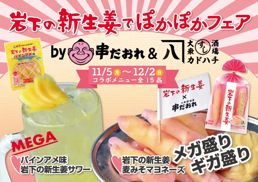 「メガ盛り・ギガ盛り岩下の新生姜」登場! 『岩下の新生姜でぽかぽかフェア』11月5日から 大衆酒場「串だおれ」「カドハチ」直営9店舗で開催