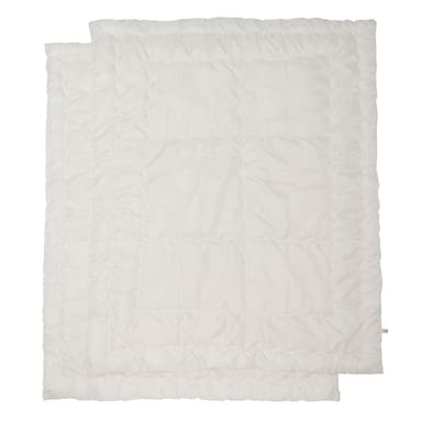 赤ちゃん用オールシーズン対応の二枚組掛けふとん。春夏には1枚で、秋冬には2枚重ねてお使いいただけます。また、たくさん汗をかく赤ちゃんに最適な洗える掛けふとんです。速乾性に優れたウォシュロン(R)綿を使用しているので、お洗濯も快適です。