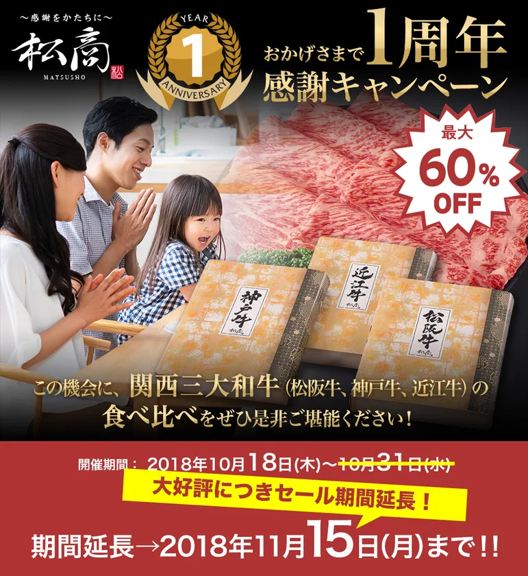 関西を中心に外食産業向けの食肉卸売、加工業を営む株式会社松商(本社:大阪市西成区、代表取締役:松田 益睦)は、ブランド牛専門ECサイトの開設1周年キャンペーンが大好評につき、期間延長にて2018年11月15日まで実施いたします。