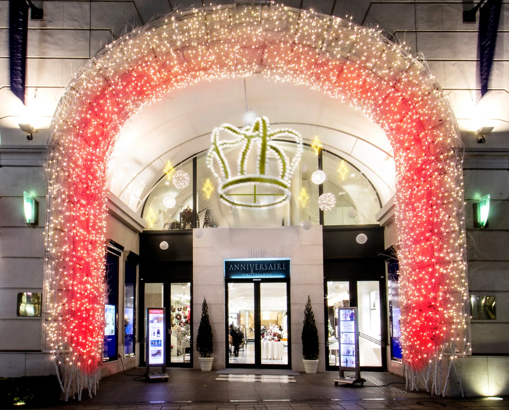 メインエントランスでは、暖かみのある赤色の「サンクスアーチ」で感謝の気持ちを表現。中央にはスワロフスキーが付いたゴールドの王冠「ビッグクラウン」が輝き、表参道のケヤキ並木を煌びやかに彩ります。