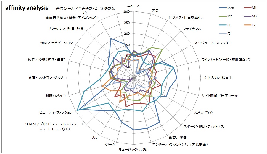 そもそも携帯スマホ活用率の高いteen・F1が全体的に非常に高いaffinityスコアです。