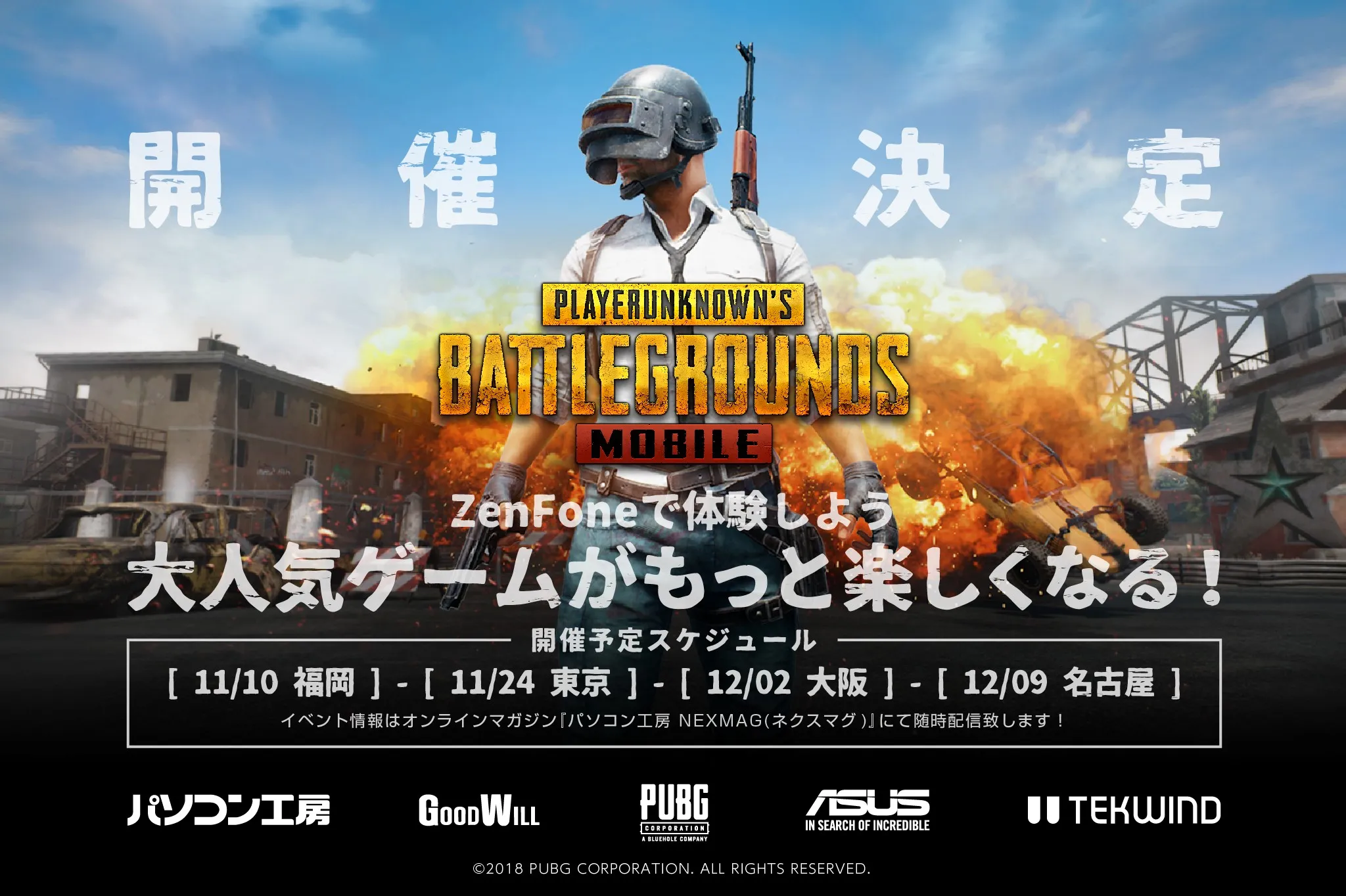 パソコン工房・グッドウィルを運営する株式会社ユニットコム(代表取締役:端田 泰三、本社:大阪市浪速区)は、各都市のパソコン工房・グッドウィル店舗内スペースにて、ASUS ZenFone5を使用して『PUBG MOBILE』のゲームプレイを体験出来る、タッチ&トライイベントを2018年11月10日(土)から12月9日(日)まで計4回開催致します。