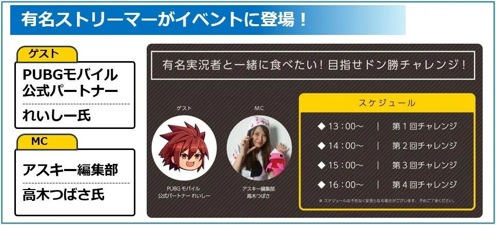 ・13時から16時まで、毎時、特別ゲストが登場!有名ストリーマーでPUBGモバイル公式パートナーを務める れいしー氏と、アスキー編集部の高木つばさ氏による「有名実況者と一緒に食べたい!目指せドン勝チャレンジ!」も開催されます。