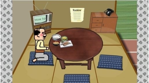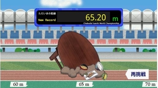 ちゃぶ台をひっくり返すように携帯端末を振り上げて、「ちゃぶ台」を飛ばします。日頃のストレスを込めて振り上げてください。飛距離を出すコツは、携帯端末を振り上げる早さのみ!