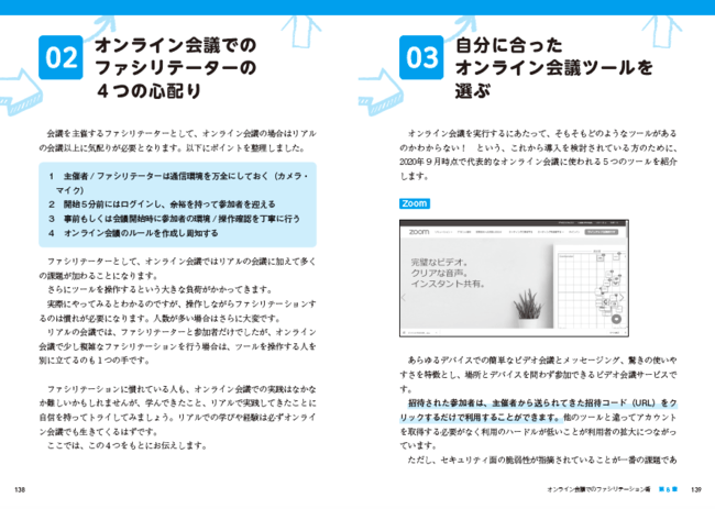 働き方が変わってきた今、会議もオンラインに変わった会社も多くあると思います。また、研修やイベントなどもオンラインで行うケースも増えてきました。本書では、オンライン会議を行う際の大切なことも伝えています。オンライン会議ならではの「ファシリテーターの心配り」をはじめ、「ツールの選び方」「画面うつりをよくするコツ」など。特に、意思の疎通が難しいオンライン会議での伝え方なども。