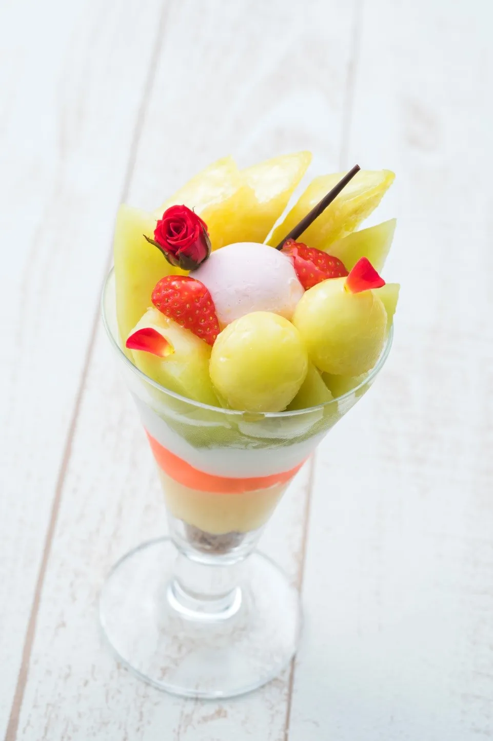 静岡県産のクラウンメロンを贅沢に1/2個使用した果実を楽しむパフェ。