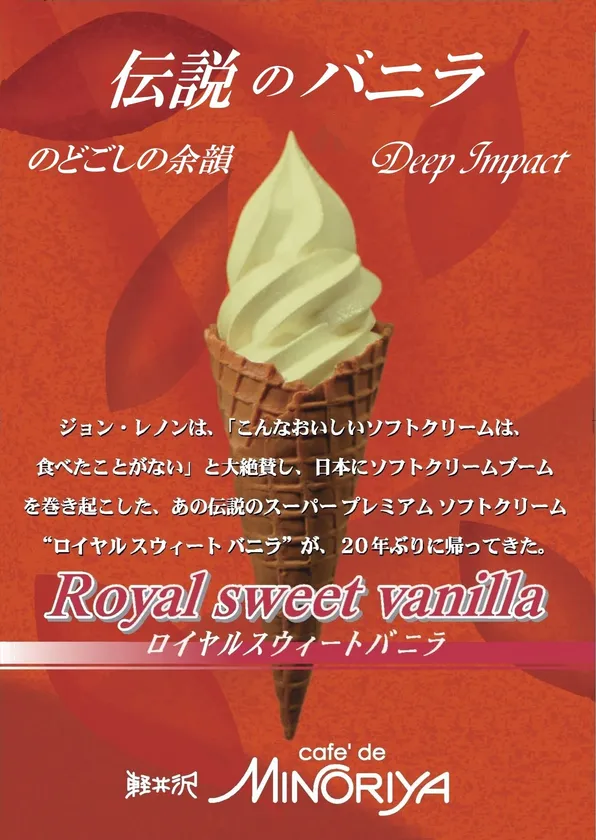 1946年にオープンした「軽井沢カフェ・ド・ミノリヤ」のロイヤルスウィートバニラは、1955年に軽井沢初のソフトクリームとして提供を開始されブームを巻き起こした、ヴィンテージ・バニラです。