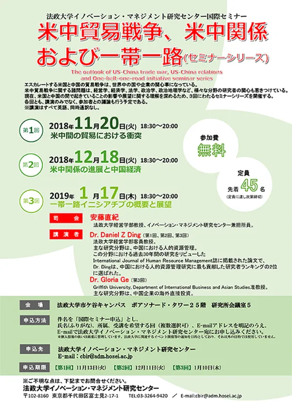 法政大学イノベーション・マネジメント研究センターは、法政大学市ケ谷キャンパスにて、11月20日(火)、12月18日(火)、1月17日(木)に全3回の国際セミナー「米中貿易戦争、米中関係および一帯一路(セミナーシリーズ)」を開催します。