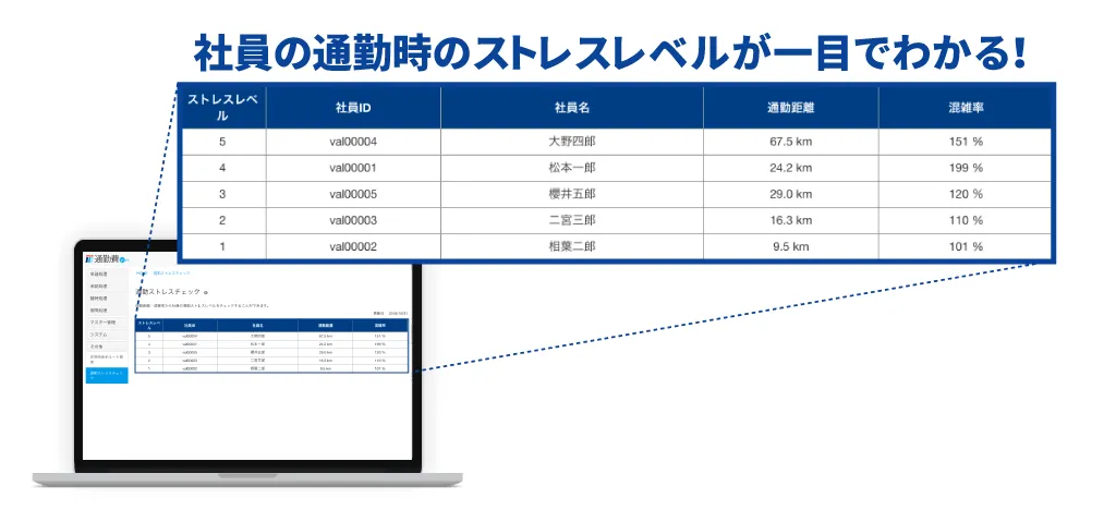 本機能では、通勤時のストレス要因となりやすい通勤距離や混雑率※といった情報をもとに、従業員ひとりひとりの通勤時のストレスレベルを独自に算出し、参考値として一覧で表示します。メンタルケアや健康経営の参考にご活用いただくことを想定しています。