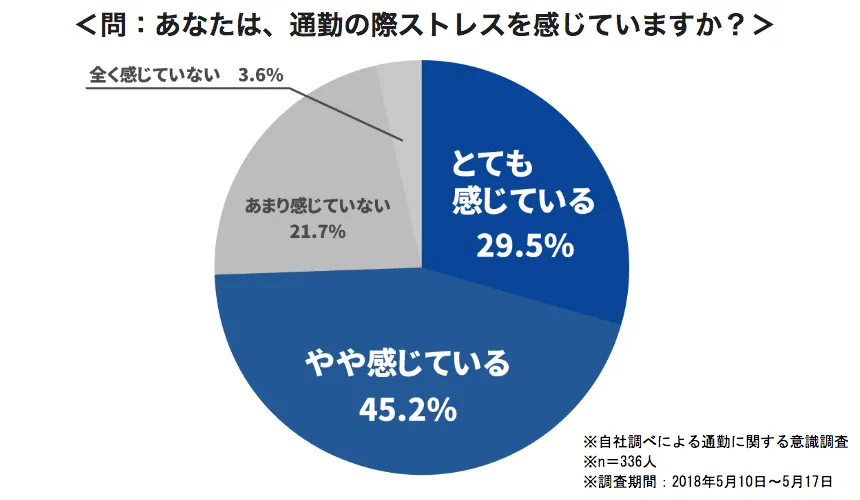 より利用者のニーズや課題にそったサービス提供をするべく、2018年5月に約330人を対象に「通勤に関する意識調査」を実施しました。その結果、全体で74.7%の方が「通勤の際にストレスを感じている」と回答しました。