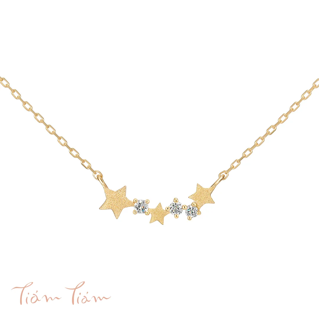 大きさと形がそれぞれ異なる3つの星。ひとつとして同じ星が無いように、あなたらしく素敵に輝いて。星とダイヤモンドをランダムに連ねた動きのあるデザインで、大人の遊び心を表現。星モチーフの表面にはスターダスト加工が施され、細やかで上品なきらめきを放ちます。