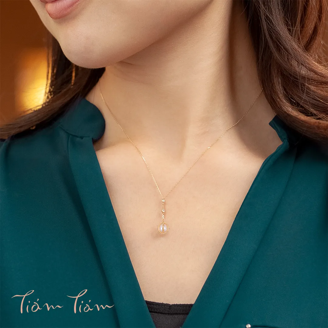 3つの輝きで、上から「過去・現在・未来」を表現したネックレス。「未来」を表すのは、しっとりと上品に輝くアコヤパール。まるで、年齢を重ねるごとに内側から輝くような美しさを増していく女性を表しているよう。パールをとり囲む金属は、過去に培った経験や大切な人たちに守られながら、未来へとさらに輝いていく様子を表しています。フロント部分のテクスチャもデザインのポイント。細かなカットが一周施されているため光を受けてキラキラと輝き、パールの存在感を一層引き立てています。