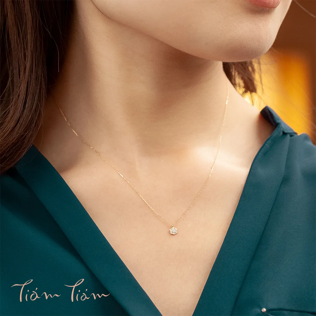 はちの巣・はちみつを連想させる六角形のネックレス。六角形には「調和と安定」といった意味合いも。幸せや、素敵なことを運んできてくれますように…。敷きつめられた上質なメレダイヤモンドが動くたびに揺れ、繊細な輝きを放ちます。