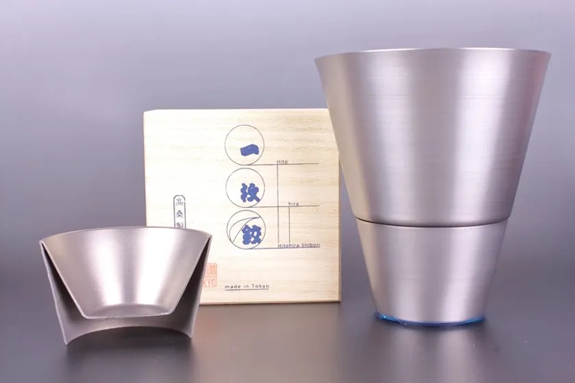 職人技の金属加工「ヘラシボリ(※1)」をさらに発展させた特許技術によりつくられます。たった一枚のチタン板から不可能とされていた二重構造の器(※2)が成形されます。収納時にはキャビネット等で「ぐいのみ」と「かたくち」が逆円錐台に重なり現代住空間に美しく馴染み、使用時には手元で見た目も感触も丸い寛ぎのアイテムに変化するデザイン。