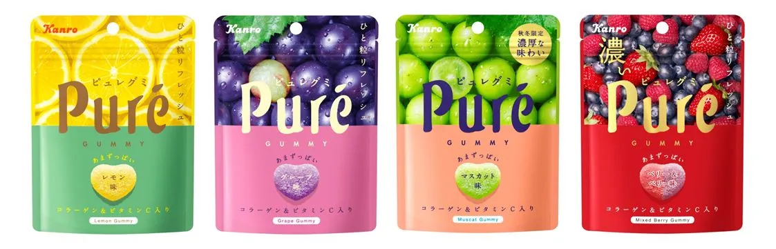 『ピュレグミ』は、2002年の発売以来、幅広い世代の方からご支持いただいているカンロの人気商品です。商品の特徴である“すっぱいパウダー”と噛むほどにフルーティな味わいが広がる“果肉食感”により、あまずっぱいおいしさで、食べた瞬間ちょっとリフレッシュできるグミです。