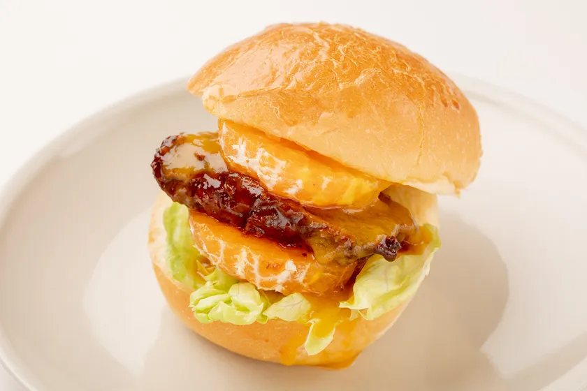 和歌山のみかんを丸ごと1個と調理長こだわりの自家製みかんソースが決め手!!みかんの間には和歌山が誇る牛肉『熊野牛』のスペアリブを挟み込みました。濃厚かつスパイスを効かせた『熊野牛』と『みかん』の果肉とソースが酸味・甘味を加え絶妙な味わいのバーガーとなりました。「旨」×「甘」×「酸」の三味がそれぞれの特徴を引き立てたバーガーです。