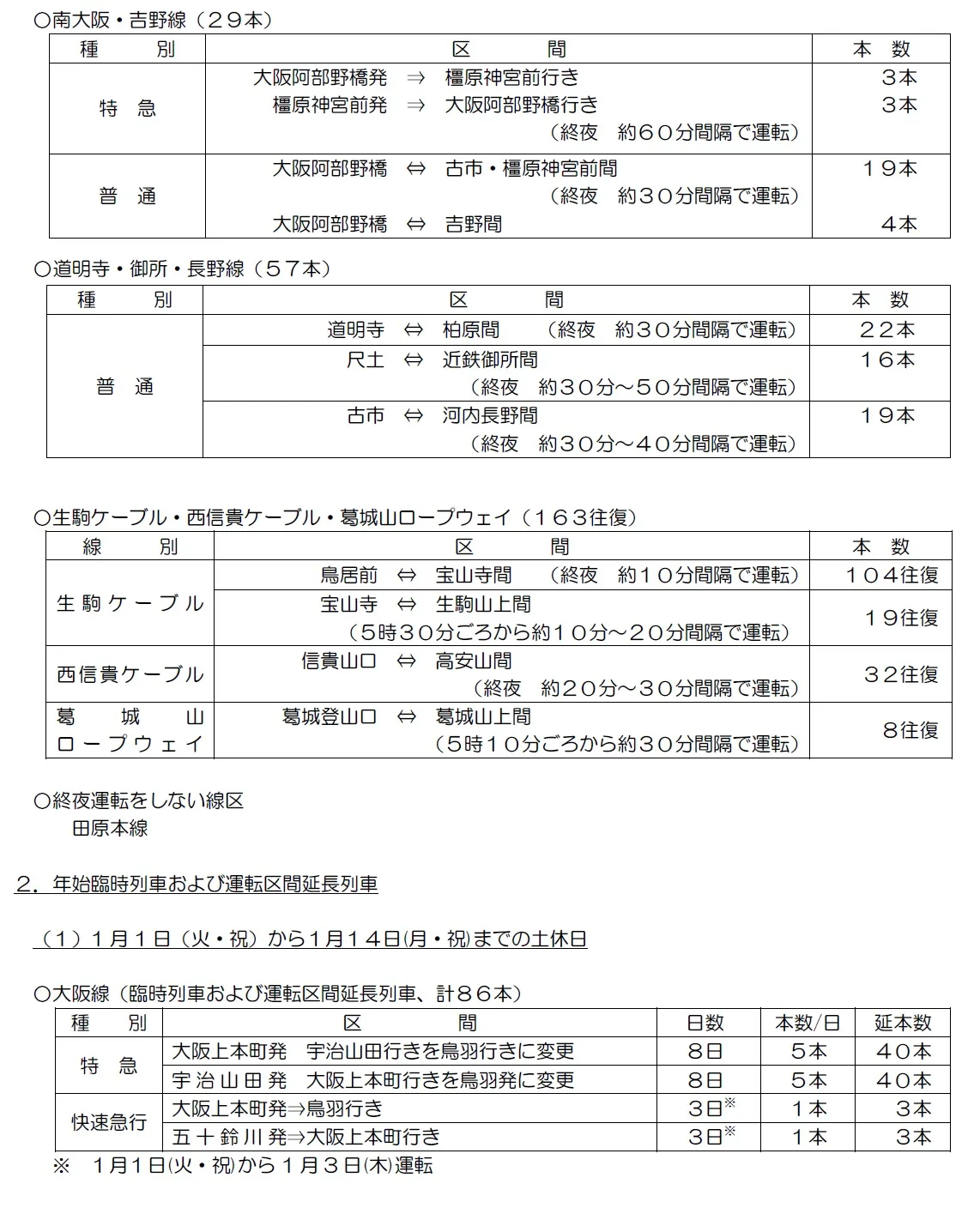 近鉄では、初詣などにお出掛けのお客さまの利便を図るため、大晦日から元旦にかけて終夜運転(一部路線は除く)を行うほか、生駒ケーブル、西信貴ケーブル、葛城山ロープウェイでも臨時便を運転します。