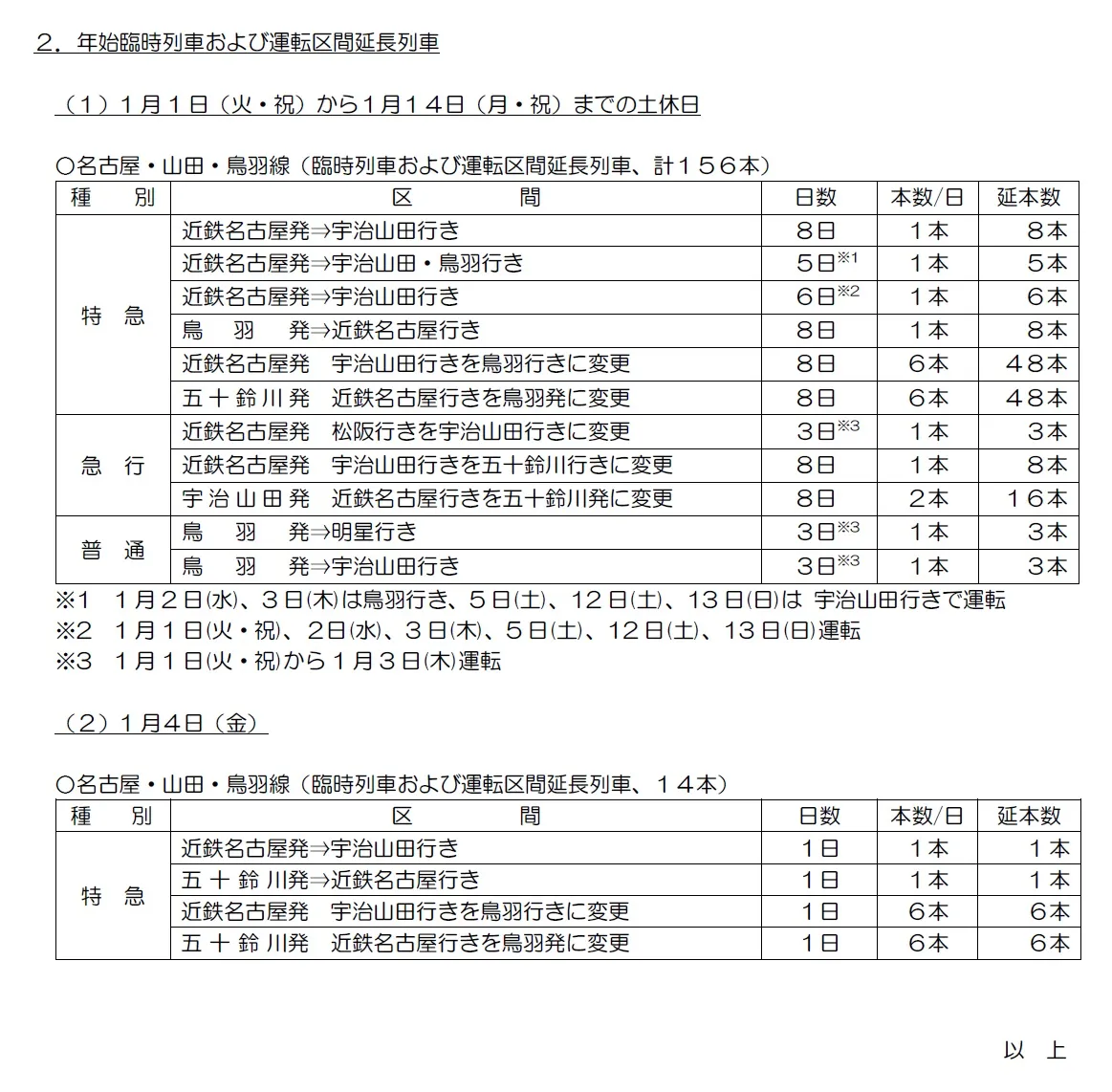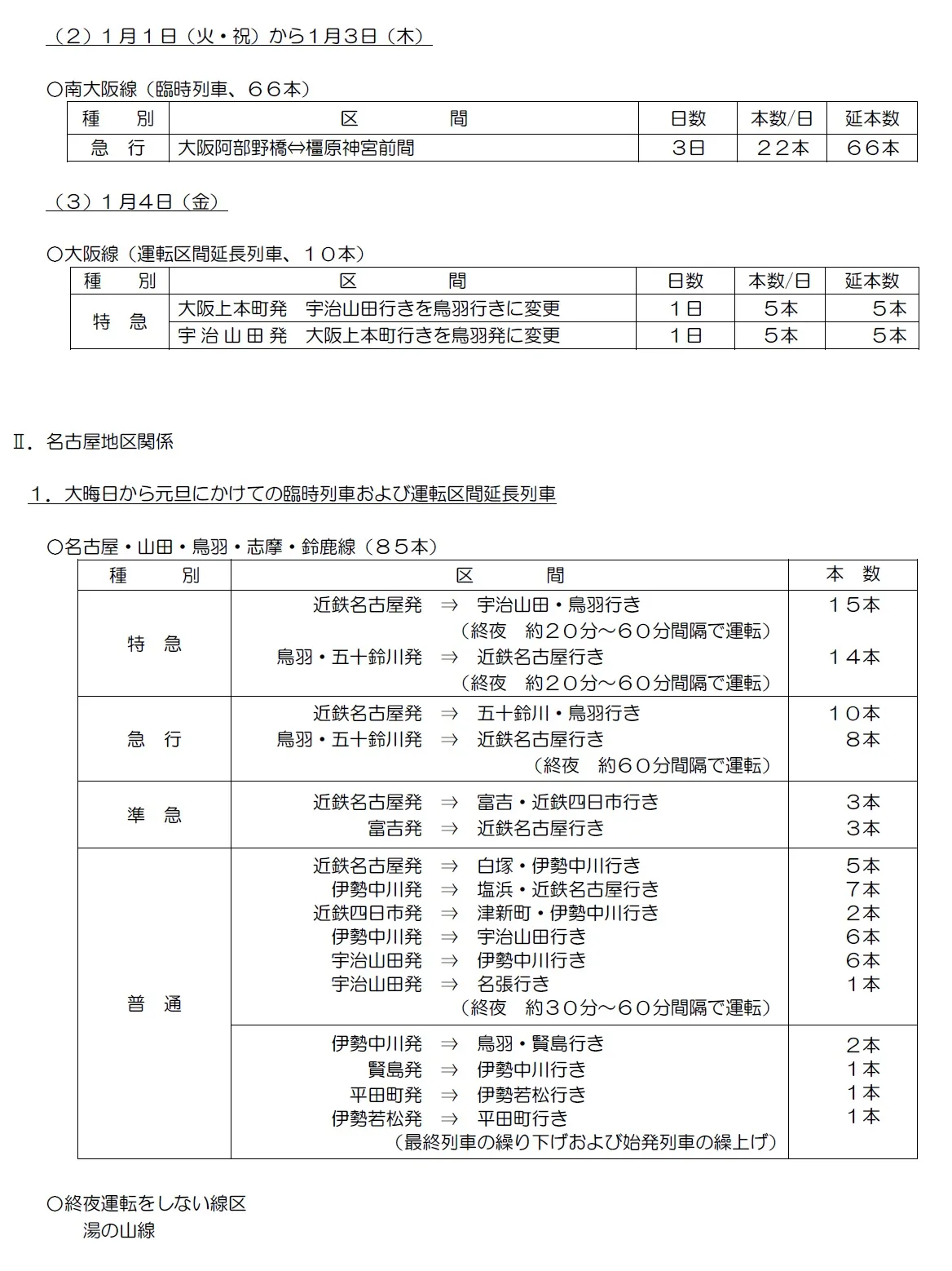 また、年末から年始にかけて大阪から伊勢方面または名古屋から伊勢方面を中心に、臨時特急列車や臨時急行列車などを運行するほか、運転区間の延長や特急列車の編成両数を増大します。