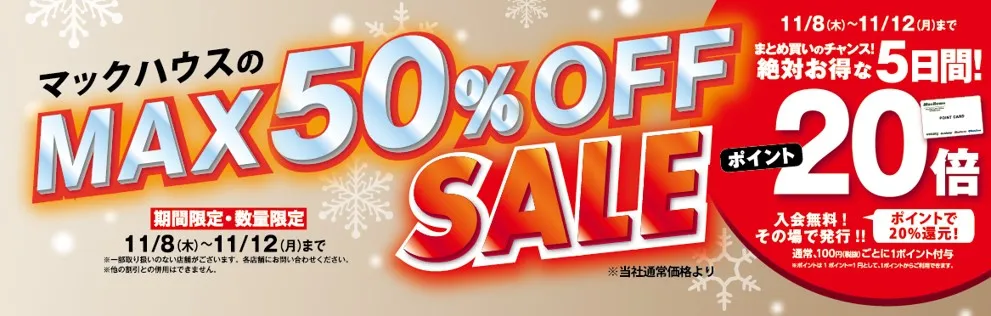 マックハウス自慢の高機能あったかアイテムを取り揃えた「MAX50%OFF SALE」に、ぜひお越しください。