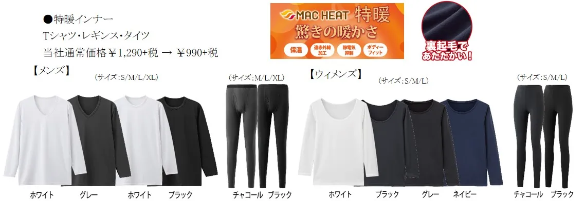 今週の新着アイテム、MAC HEATインナーシリーズから、今年は極上の温かさを追求した『発熱キルトイナー』が早くもお買い得価格になりました。三層構造のキルト編みによってできる空気層に身体の熱を溜め込むため、暖かく快適な着心地を実現しました。もちろん、気温・シーンに合わせて暖かさが選べる「マックヒートインナー」シリーズも豊富に取り揃えております。