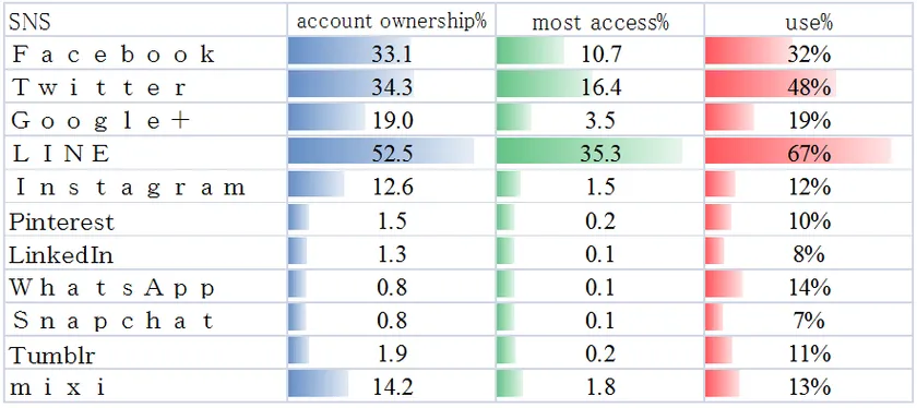 TwitterとFacebookについては、1 to 1のツールというより、お手軽な1 to allへのツールがフォロワー数も多い、という事だと考えられます。LINEは1 to 1ツールであるという意味合いが強いので、アカウント数や使用頻度は圧倒的上位ですが、フォロワー数では上位に来なかった、という事でしょう。