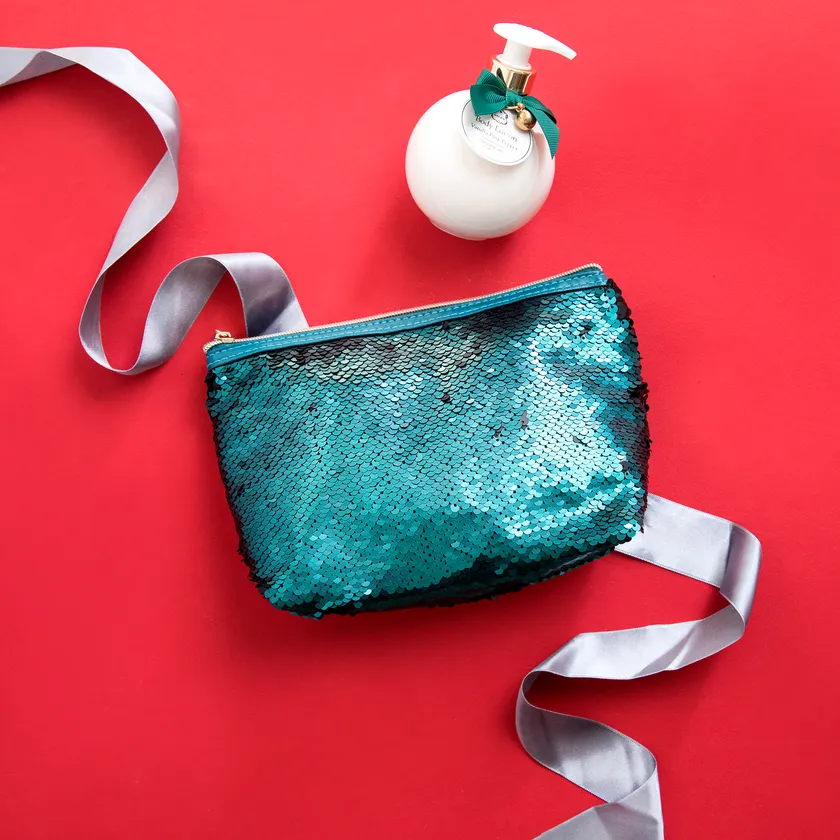 「グリッタードリームセット」は、ころんとした丸いデザインのシマリングシャワージェルとボディーローションがセットになり、キラキラ輝くスパンコールのシャワーバッグもついた充実のセットです。