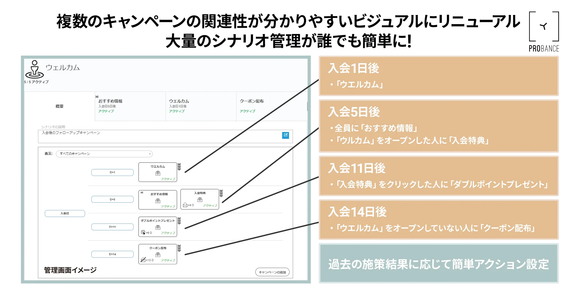 「Probance」は大量のキャンペーン管理が可能である点を強みにしており、今回の「ビジュアルシナリオマネジメント」では、管理画面上の複雑なフロー記述を避け、設定を確認したいキャンペーンにマウスオーバーすることで、設定内容、プレビュー、そのキャンペーンに紐づく全てのキャンペーンの配信タイミングを確認できるようになりました。加えて、キャンペーン同士の関連性についてコメントも記述できるようになり、誰が見てもどのキャンペーンがどのように組み合わさっているのかがわかるようになりました。