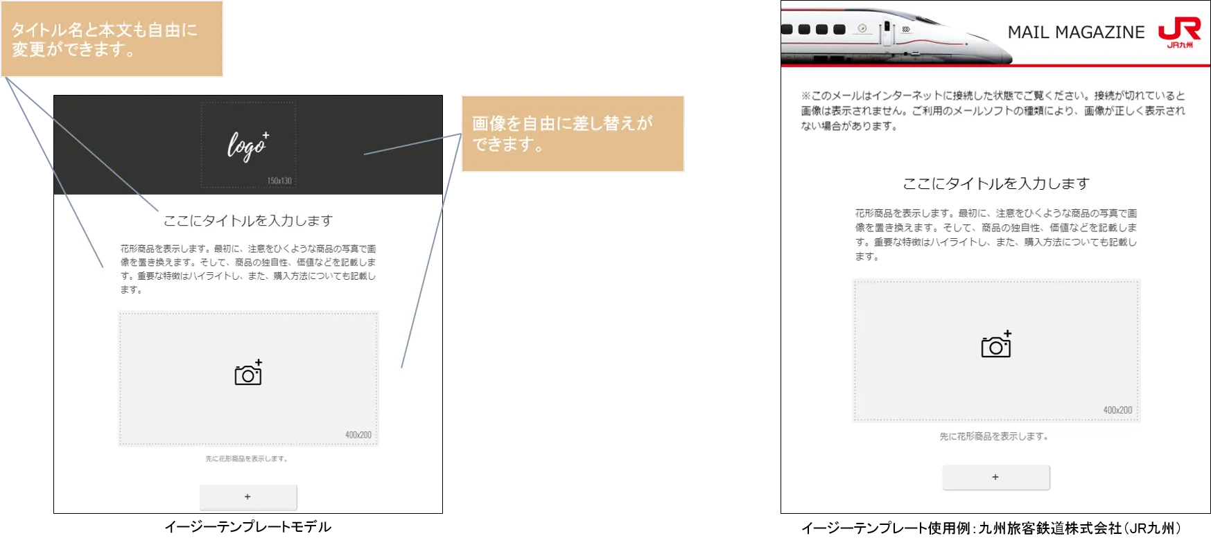 企業やブランドイメージごとにカスタマイズされたHTMLメールが簡単に作成できます。これにより、HTMLの記述に不慣れな担当者でも、テキストの編集やイメージ画像の差し替え等の基本的な操作を簡単に行うことができます。