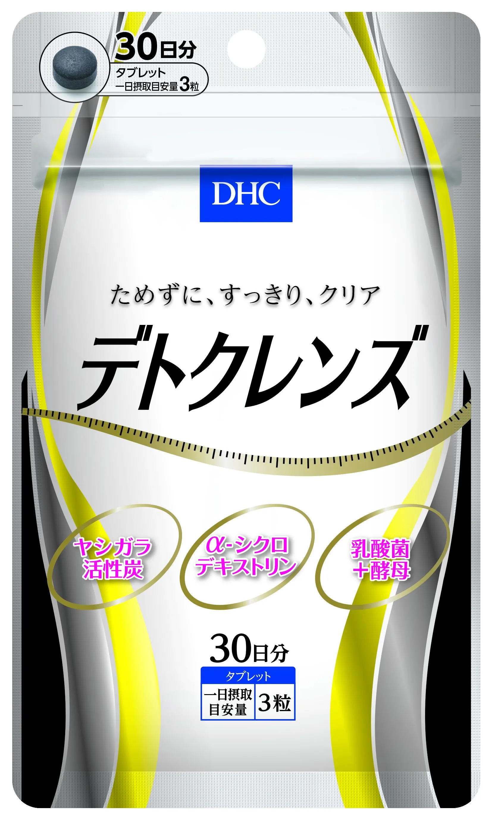 このたび、DHCが発売するサプリメント「デトクレンズ」は、「炭のチカラ」に着目した新しいサプリメントです。主原料は「ヤシガラ活性炭」。その他にも、食事の脂にアプローチする天然由来の食物繊維「α-シクロデキストリン」、健やかな環境をキープする50兆個※の「乳酸菌+酵母」を配合。ため込む前の1日3粒が、「カラダもココロも軽やかな毎日」を応援します。