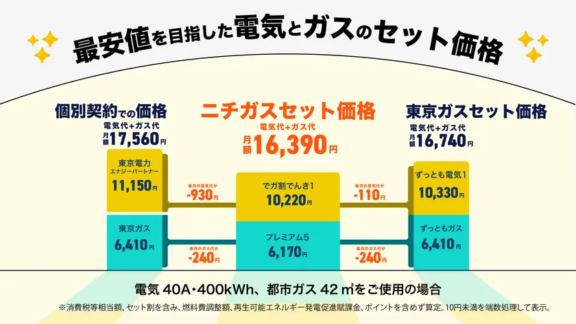 当社は、どこにも負けない“業界最安値”のセットプランを目指し、でんきとガスのセット割引で“お得がでガい(大きい)「でガ割」”を、11月より販売開始いたしました。「でガ割」は、電気とガスをセットでご契約いただくことでお得になるプラン(*1)です。一般的な電気とガスのご使用量のご家庭(*2)が「でガ割」にご契約いただくと、個別契約での価格に比べて月々1,170円、年間では約14,000円もお安くなります。