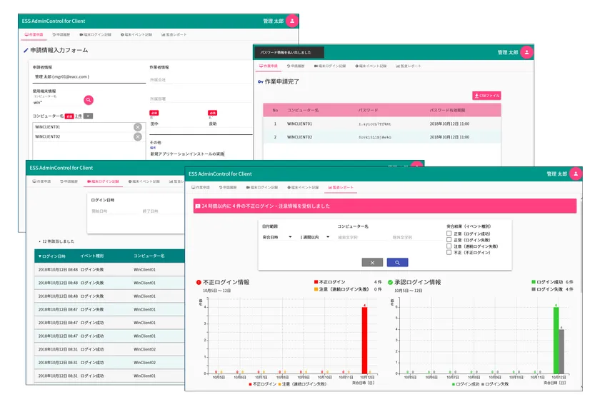 「ESS AdminControl for Client」の操作インターフェイスおよびレポート画面