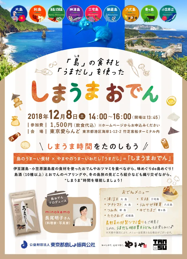 島というと、夏のイメージが強く、冬は閑散期やオフシーズンと思われがちです。しかし、冬の島にも魅力はたくさんあります。東京愛らんどでは、東京諸島の冬の魅力を味わっていただける、やまや「うまだし」とのスペシャルコラボイベント『しまうまおでん』を12月8日(土)に開催致します。料理家の長尾明子さんをゲストに迎え、この日限りの“長尾流”島おでんであたたまりながら冬の島旅を解説。さらに、島酒にもぴったりの島野菜の特製ツマミ盛りをご用意致します。各島の旬の食材を使用したおでんを食べながら、ゆっくり島めぐり気分を味わいませんか?