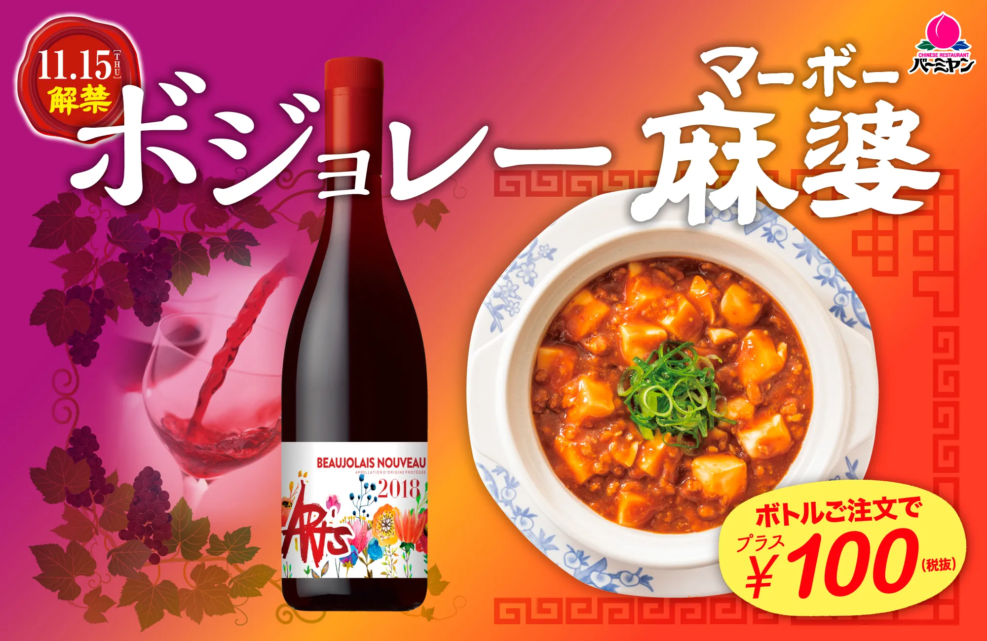 毎年11月の第3木曜日の恒例行事となっている「ボジョレーヌーボー解禁」。「ボジョレー麻婆(マーボー)」キャンペーンでは、解禁日の0:00よりボジョレーヌーボーのボトル1本とバーミヤン自慢の麻婆豆腐をお楽しみいただける“ヌーボー”と“マーボー”がセットになった特別限定メニューを販売いたします。