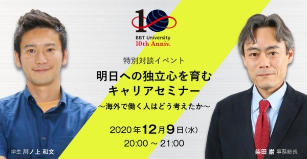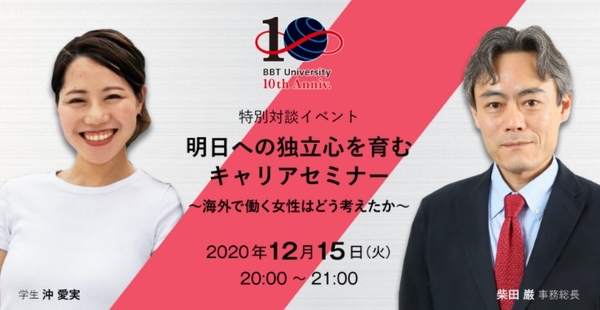 あらゆる年齢層に対し生涯に渡るリカレント教育を提供する株式会社ビジネス・ブレークスルー(所在地:東京都千代田区、代表取締役:柴田巌、以下BBT)が運営するビジネス・ブレークスルー大学(学長:大前研一、以下BBT大学)は、BBT大学経営学部10周年を記念したイベントの一環として、働く女性・海外で働くビジネスパーソン・トップアスリート・海外で働く女性であるBBT大学の卒業生・在学生と本学の教員で、キャリアに関する対談セミナーを開催します。全4回すべてオンラインで行われ、第1回は本日20時開始します。(参加費:無料)