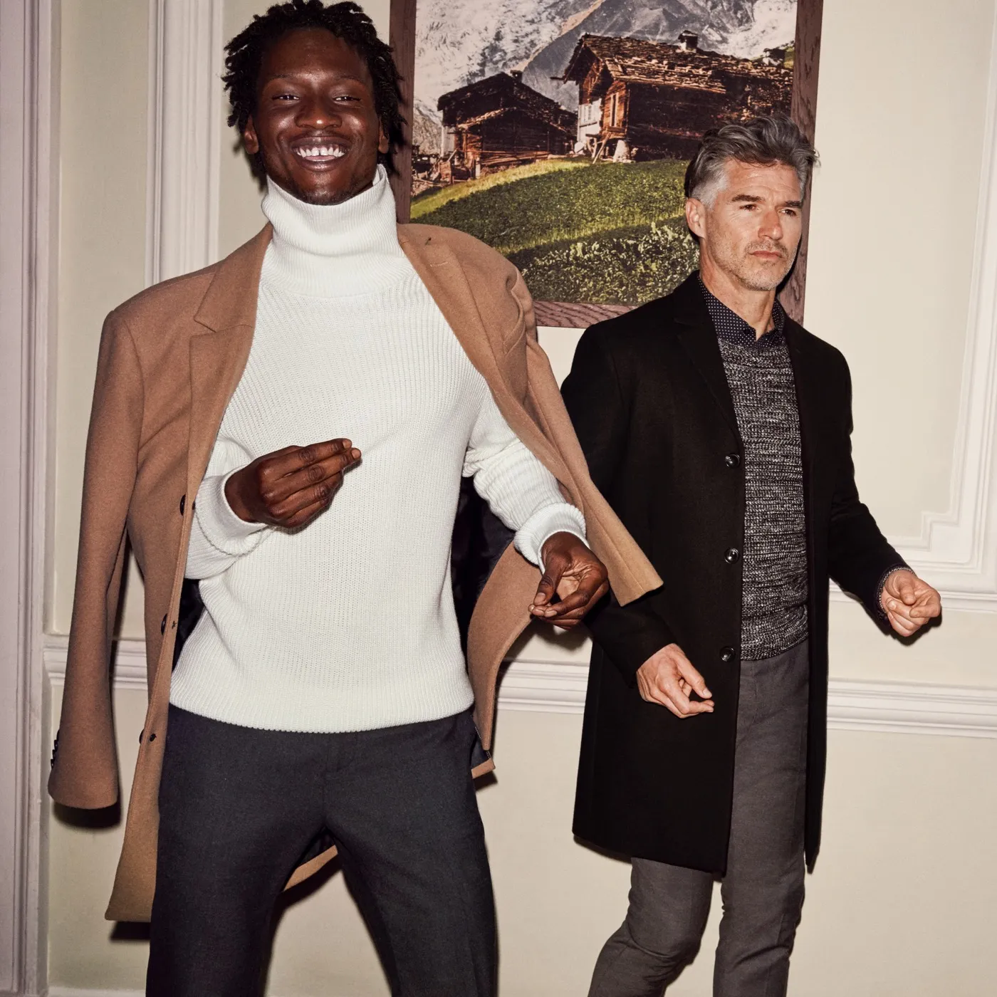 シックな柄のスリムフィットシャツ、ツーピーススーツ、ロールネックのセーター、丹念に作り込まれたローファー、ホリデーシーズンのスタイリッシュなパーティーウェアが揃います。スマートなシャツやケーブルニット、ポロネックのプルオーバーはコートの下の一枚に最適。